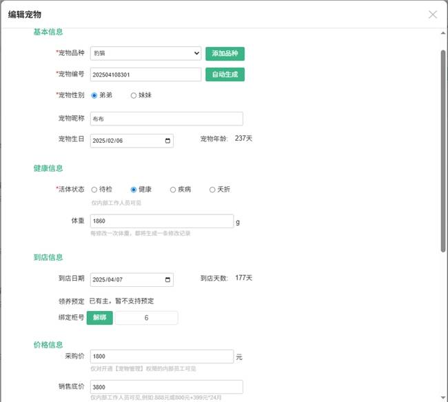 寵物建檔:可以詳細(xì)記錄寵物信息,包括寵物品種、寵物編號(hào)、寵物性別、寵物昵稱、生日、狀態(tài)、體重、到店日期、寵物所在柜、預(yù)定狀態(tài)、寵物采購(gòu)價(jià)、寵物銷售價(jià)等等信息,還可以更據(jù)門店特殊需求,自定義字段添加。