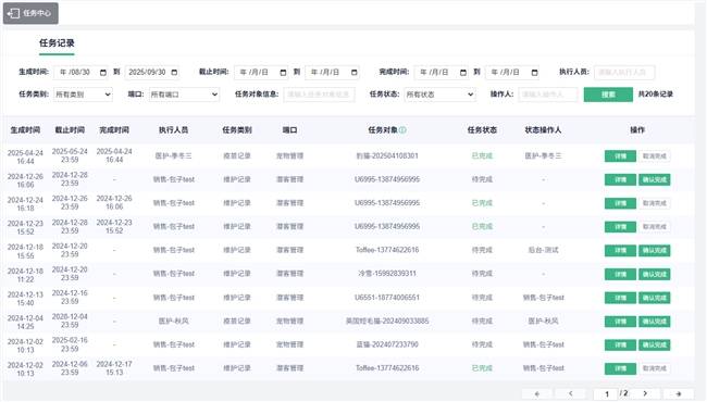 所有記錄添加后均可添加二次維護(hù)任務(wù),幫助醫(yī)護(hù)人員進(jìn)行后續(xù)維護(hù)。比如可以提醒下次疫苗使用時(shí)間。該功能還可以用于后續(xù)對(duì)寵物主人的提醒。所有的維護(hù)任務(wù)都會(huì)生成到任務(wù)中心,幫助管理者清晰的了解到所有任務(wù)的完成情況。
